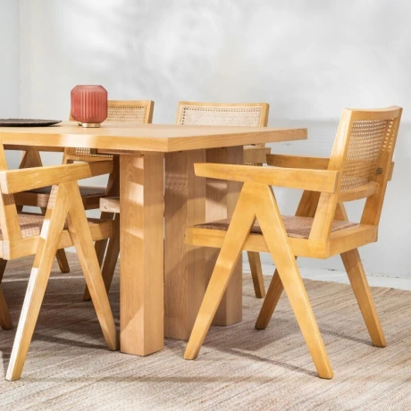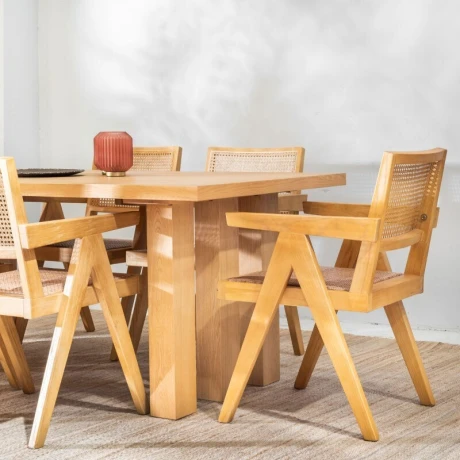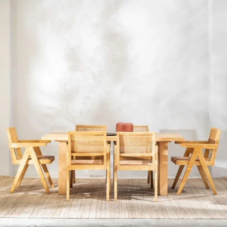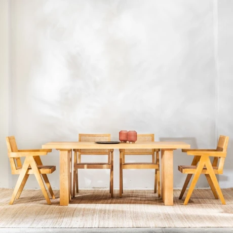 En este juego combinamos nuestra mesa de comedor Hibisco+ 6 Phuket Teca.