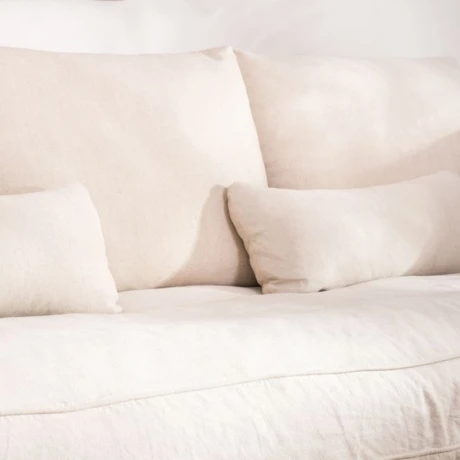 Estructura en madera maciza, con relleno de espuma alta densidad y plumón sintético. Tapizado en lino y algodón. Fundas extraíbles para fácil limpieza.