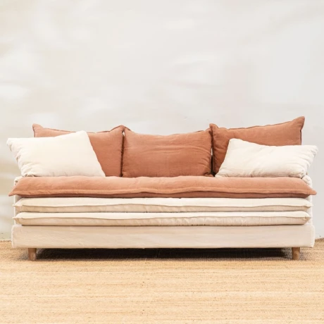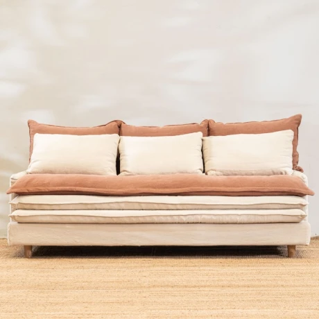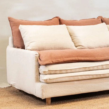Estructura en madera maciza, con relleno de espuma alta densidad y plumón sintético. Tapizado en lino y algodón. Fundas extraíbles para fácil limpieza.