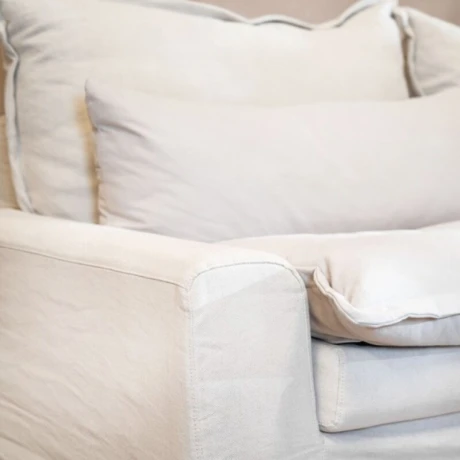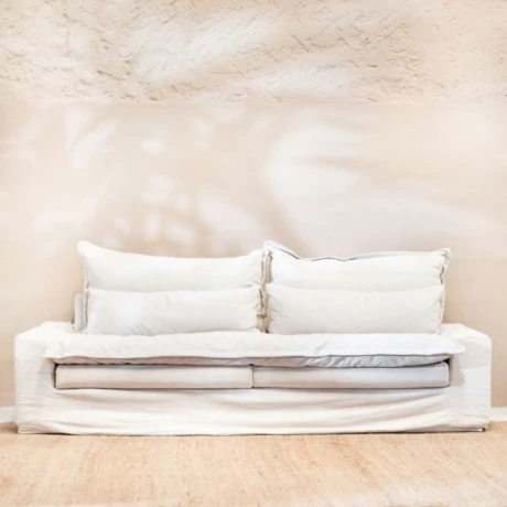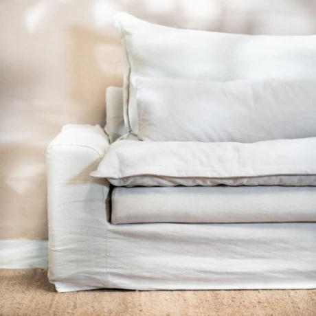 Estructura de madera maciza, relleno en espuma de alta densidad, fibra siliconada y plumón sintético, fundas completamente desmontables y lavables.